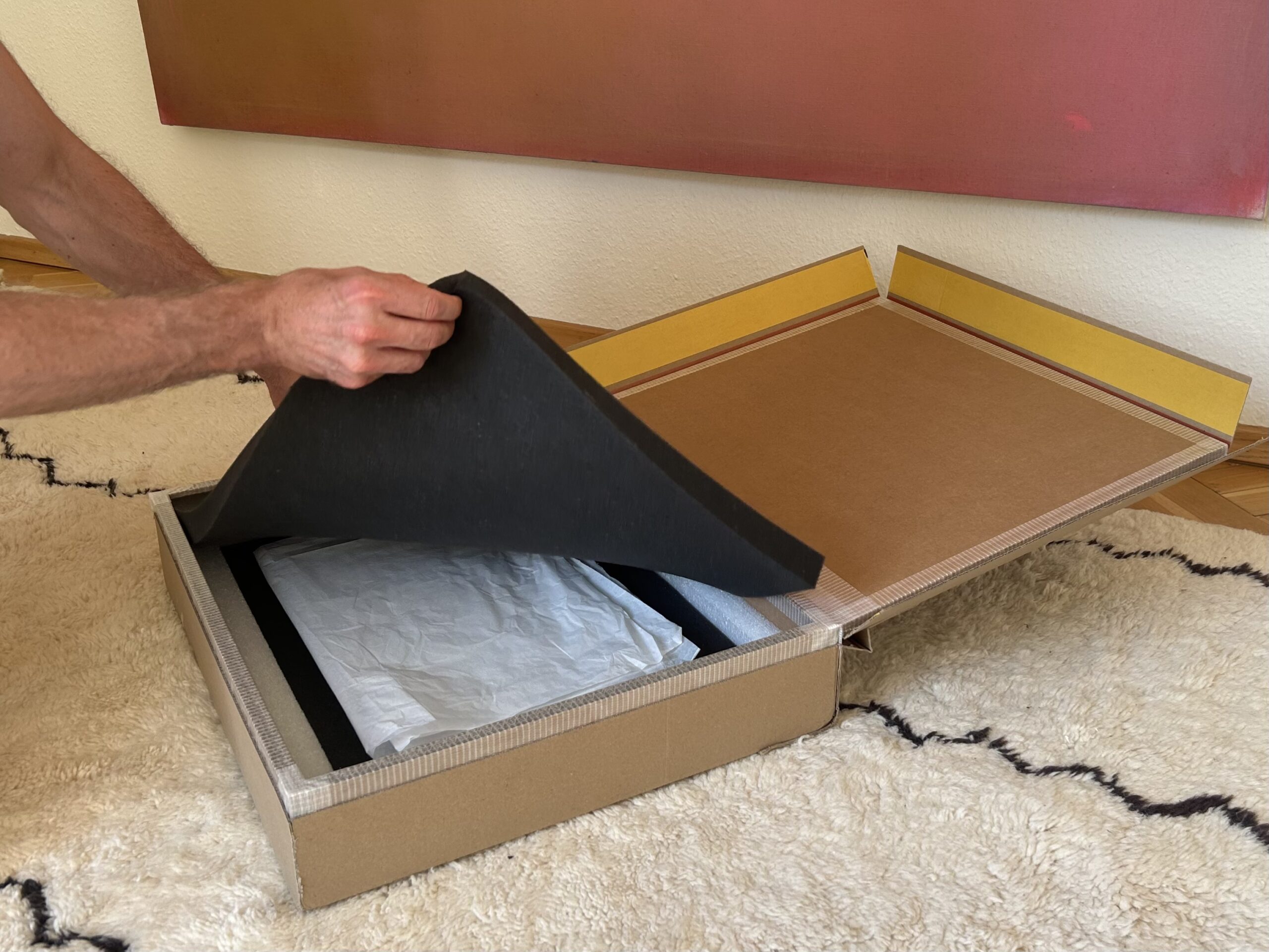 Notre carton d’expédition spécialement conçu est doublé de mousse sur tous les côtés, protégeant ainsi votre œuvre d’art contre les chocs et les vibrations. Si vous souhaitez envoyer une peinture ou un tableau encadré, nous vous fournissons un papier spécial avec le carton, dans lequel vous enveloppez d’abord le tableau pour protéger la surface. Ensuite, il vous suffit de le placer dans l’empreinte en mousse. Pour les objets et les sculptures, les cartons sont doublés de coussins d’air pour amortir les chocs. Notre emballage est composé d’un carton robuste renforcé par trois couches, idéal pour l’expédition d’œuvres d’art et d’objets fragiles. En particulier lors des transports par services de messagerie, les colis sont souvent empilés et transbordés, il est donc important d’utiliser un emballage approprié et résistant. Nos cartons ont été largement testés en pratique et optimisés pour ce type de transport.